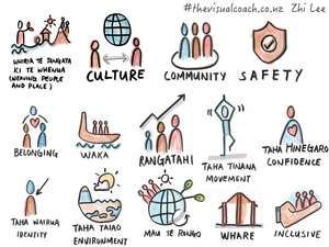 2.5 metre long poster produced live Visually representing the needs of young Maori entrepreneurs Poster alongside sticky-notes showing the harvesting process whereby information is…